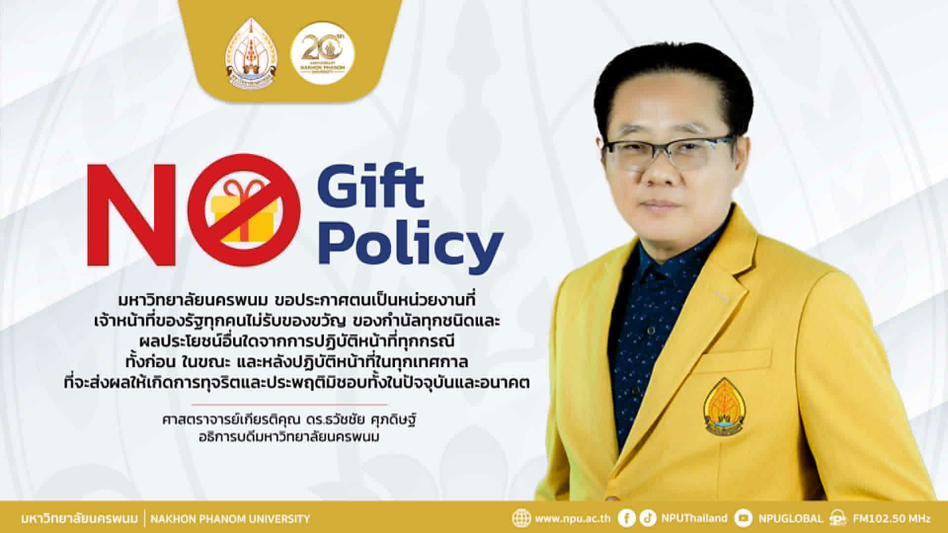 วันที่ 26 พฤศจิกายน 2568 เวลา 13.30 น. ณ ห้องประชุมพนมนาคา ชั้น 5 อาคารสำนักงานอธิการบดี 1 มหาวิทยาลัยนครพนม เขตพื้นที่ศรีโคตรบูรณ์ ศาสตราจารย์เกียรติคุณ ดร.ธวัชชัย ศุภดิษฐ์ อธิการบดีมหาวิทยาลัยนครพนม มอบนโยบายสำคัญแก่คณะผู้บริหาร เรื่องการ ไม่รับของขวัญและของกำนัลทุกชนิดจากการปฏิบัติหน้าที่ (No Gift Policy) ประจำปีงบประมาณ พ.ศ. 2569 นโยบายดังกล่าวมีเป้าหมายเพื่อเสริมสร้างวัฒนธรรมองค์กรที่ยึดมั่นใน ธรรมาภิบาล ความซื่อสัตย์สุจริต ความโปร่งใส และการตรวจสอบได้ อันเป็นหลักสำคัญในการบริหารราชการของมหาวิทยาลัยนครพนมให้เป็นไปอย่างมีคุณธรรม สร้างความเชื่อมั่นแก่สังคม และเกิดประโยชน์สูงสุดต่อประเทศชาติและประชาชน