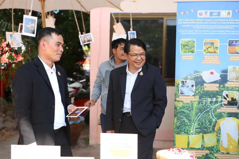 จากนั้น คณะฯ ได้เยี่ยมชม ศูนย์วิสาหกิจชุมชนธาตุพนมแฮนด์คราฟ อำเภอธาตุพนม เพื่อชมกระบวนการผลิตผ้ามัดย้อมสีจากดอกดาวเรือง ตั้งแต่ขั้นตอนการเตรียมวัตถุดิบ การย้อมสี ไปจนถึงการพัฒนาผลิตภัณฑ์เชิงสร้างสรรค์ โดยมีชาวบ้าน ผู้เข้าร่วมโครงการ และปราชญ์ชุมชน ร่วมให้ข้อมูลและแลกเปลี่ยนประสบการณ์แก่คณะผู้ตรวจราชการฯ สะท้อนถึงการบูรณาการองค์ความรู้จากมหาวิทยาลัยสู่ชุมชนอย่างเป็นรูปธรรม